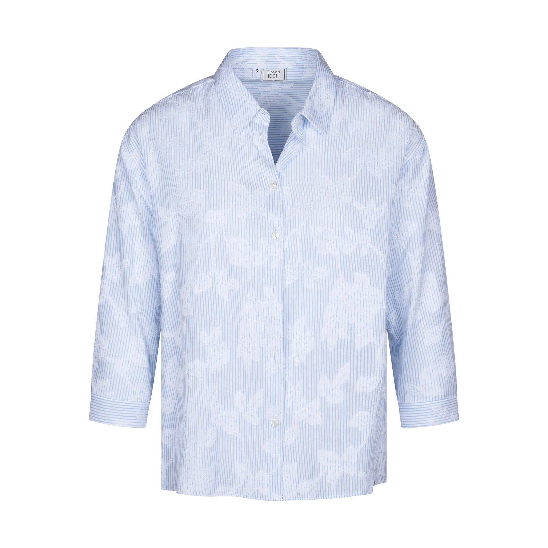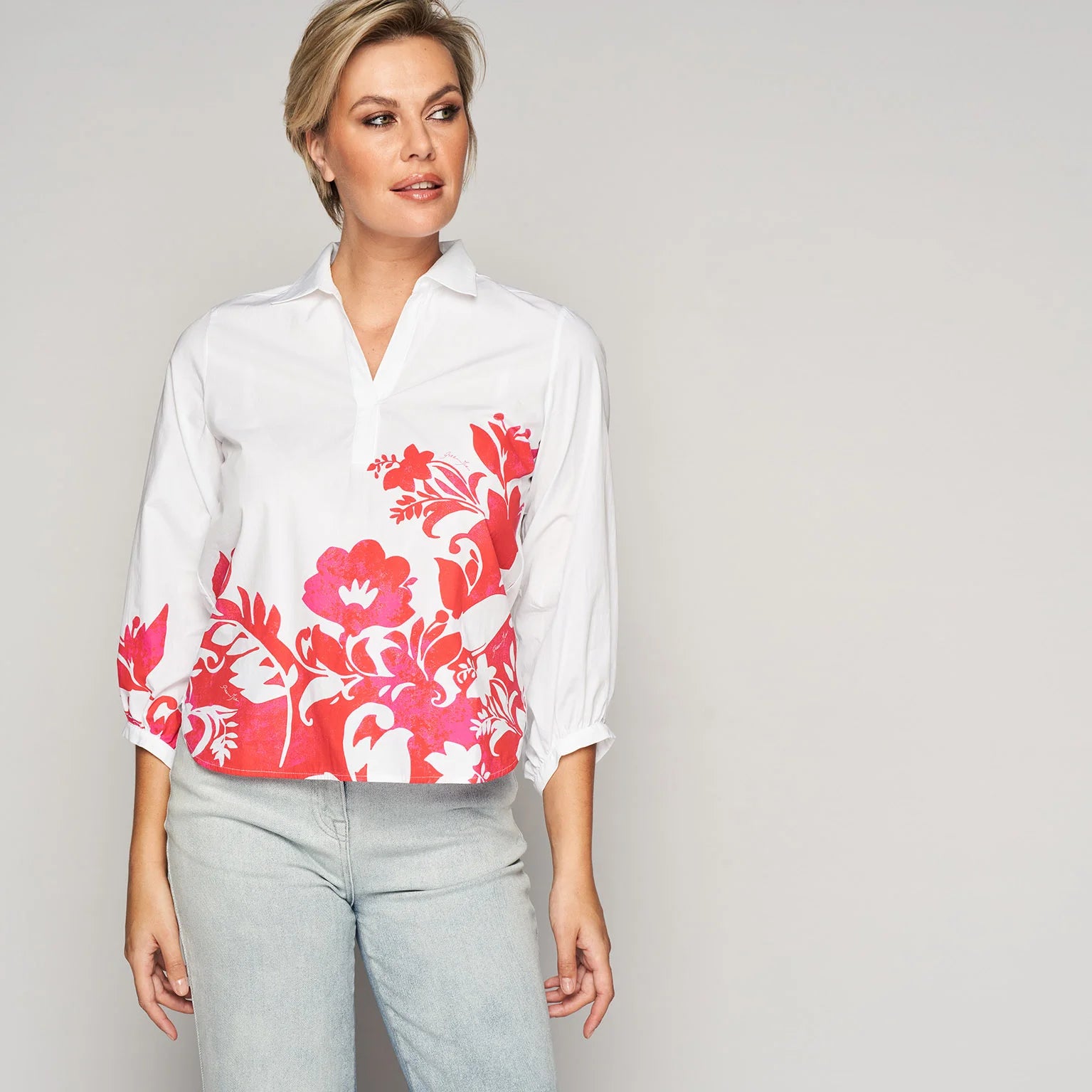 Een blouse met overhemdkraag en V-hals, voorzien van een print voor een elegante en luchtige uitstraling.