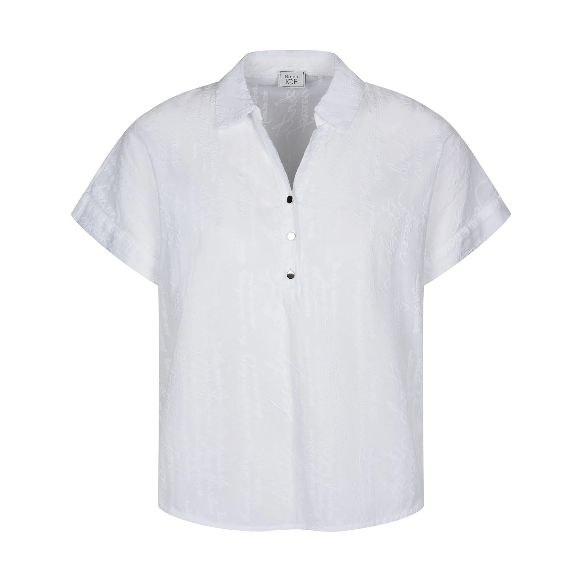 Blouse met V-hals en knoopsluiting in de V-hals, afgewerkt met kleine tekst in dezelfde kleur als de blouse, voor een...