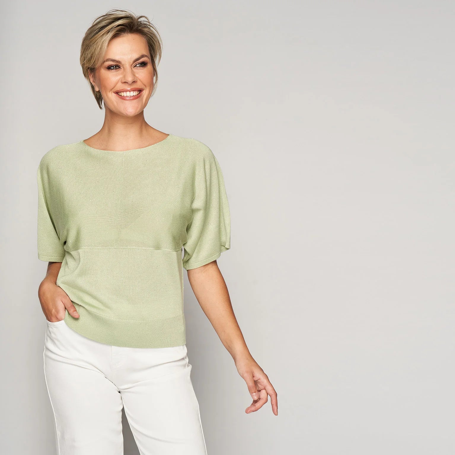 Lichte fijngebreide trui met korte mouwen en afgewerkt met enkele pailletten voor een elegante en comfortabele look