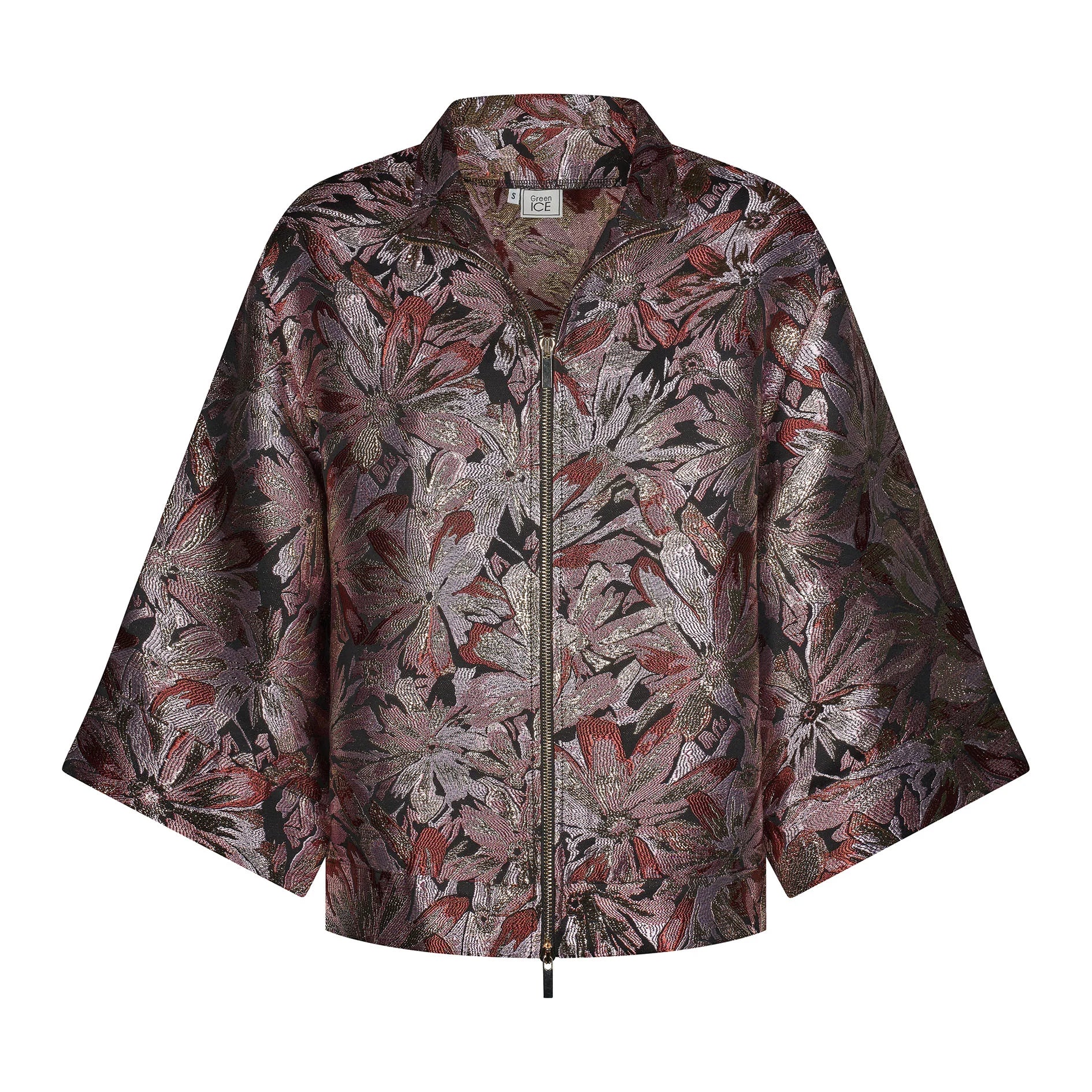 Een jacquard vest, voorzien van een 3/4de mouw en afgewerkt met een bloemen patroon