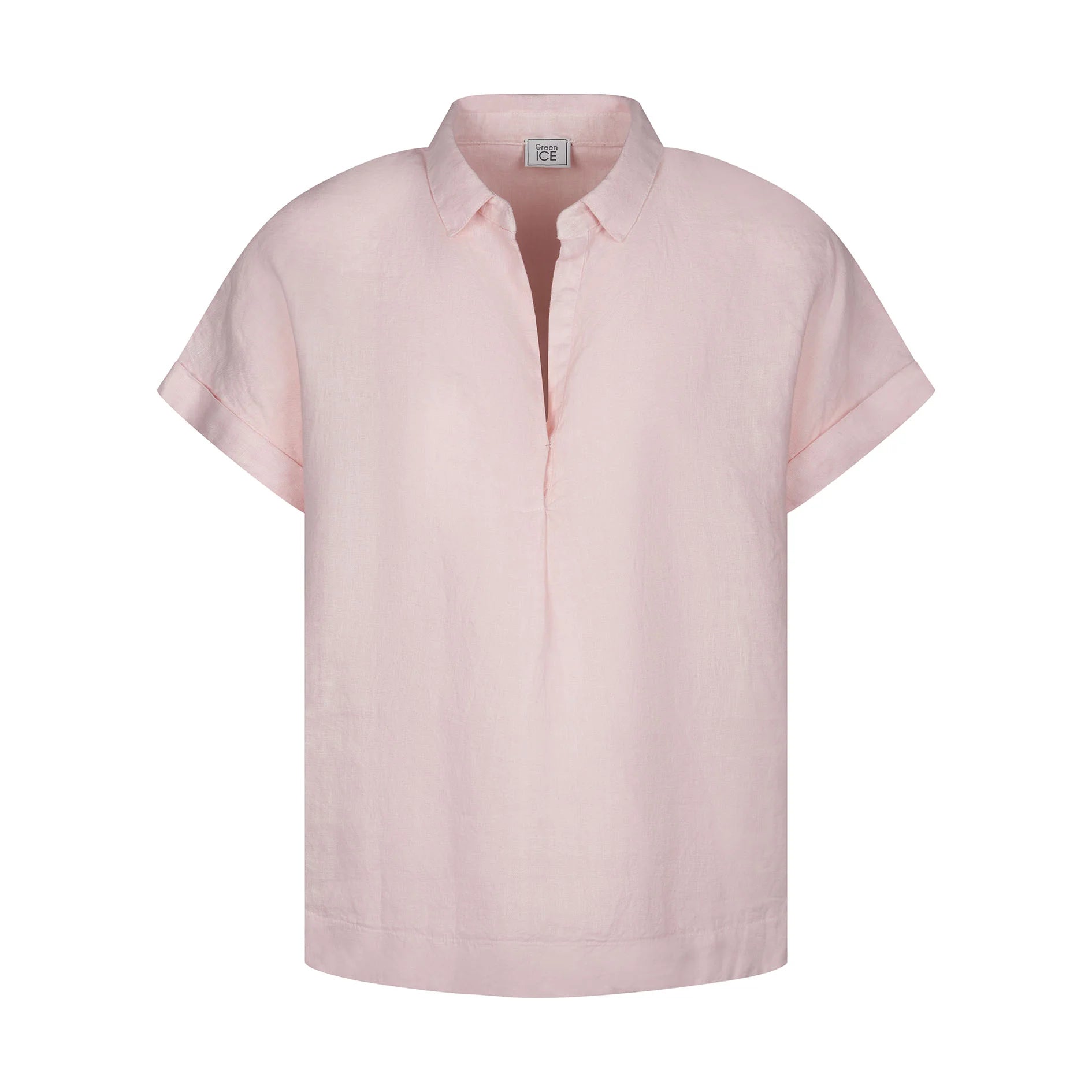 Een effen, linnen blouse afgewerkt met een ingesneden v-hals