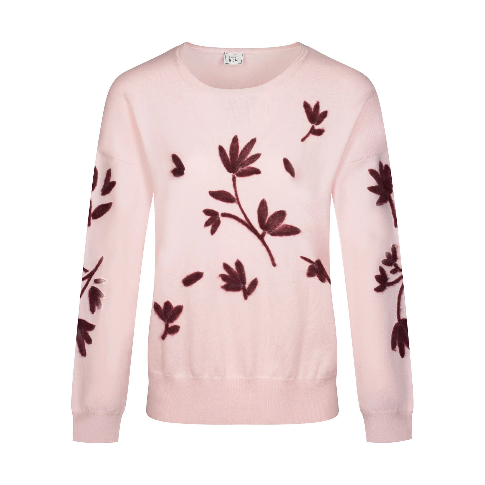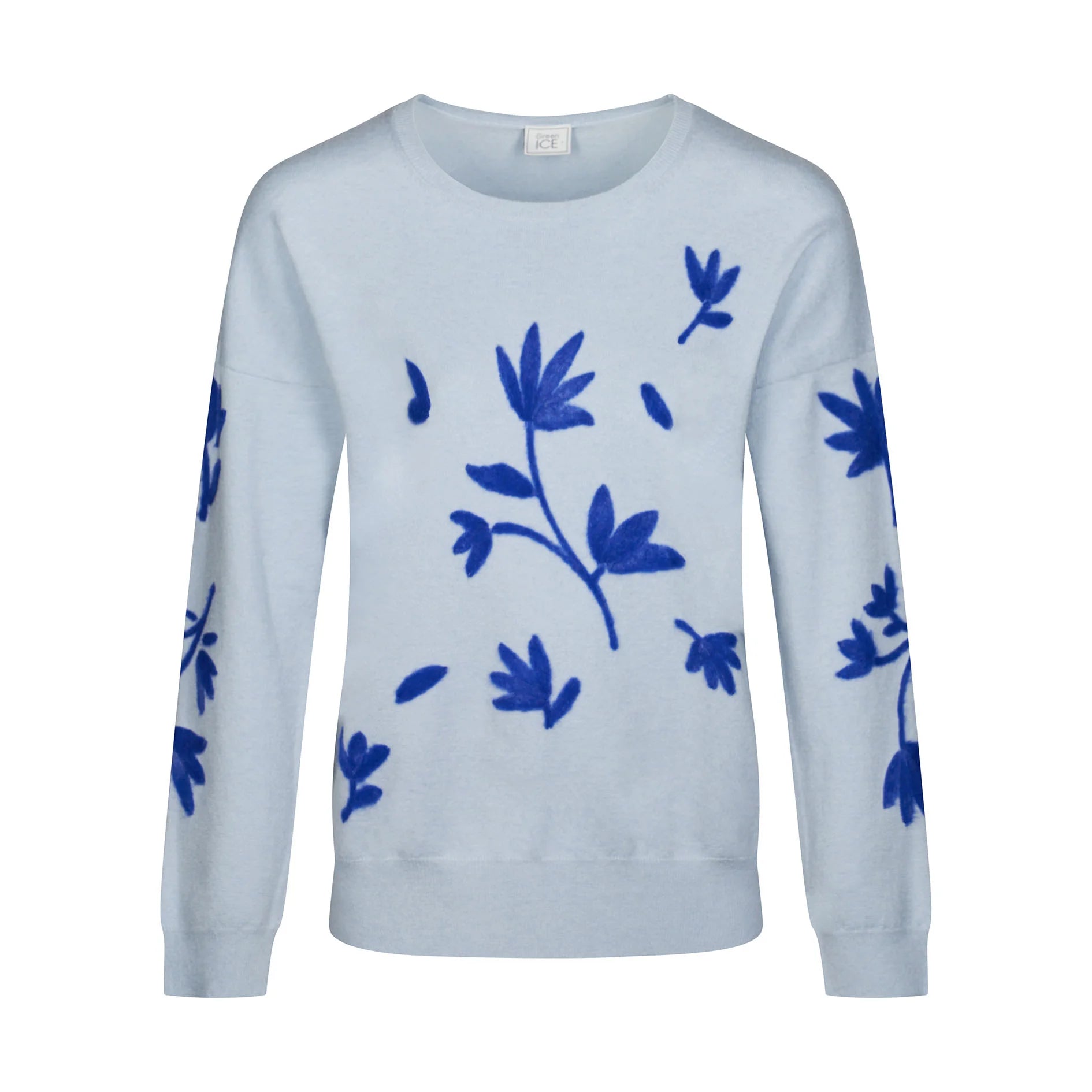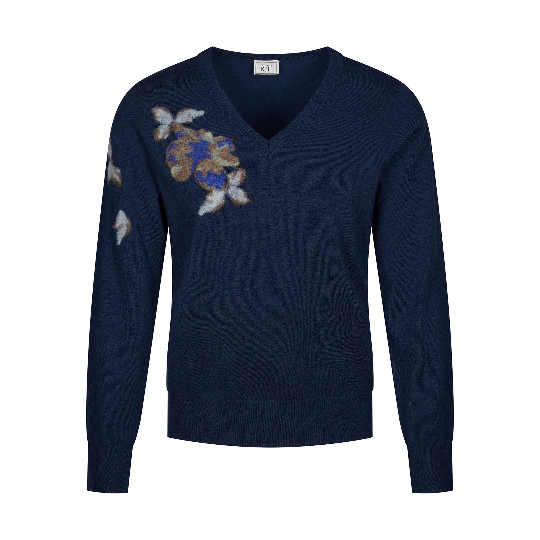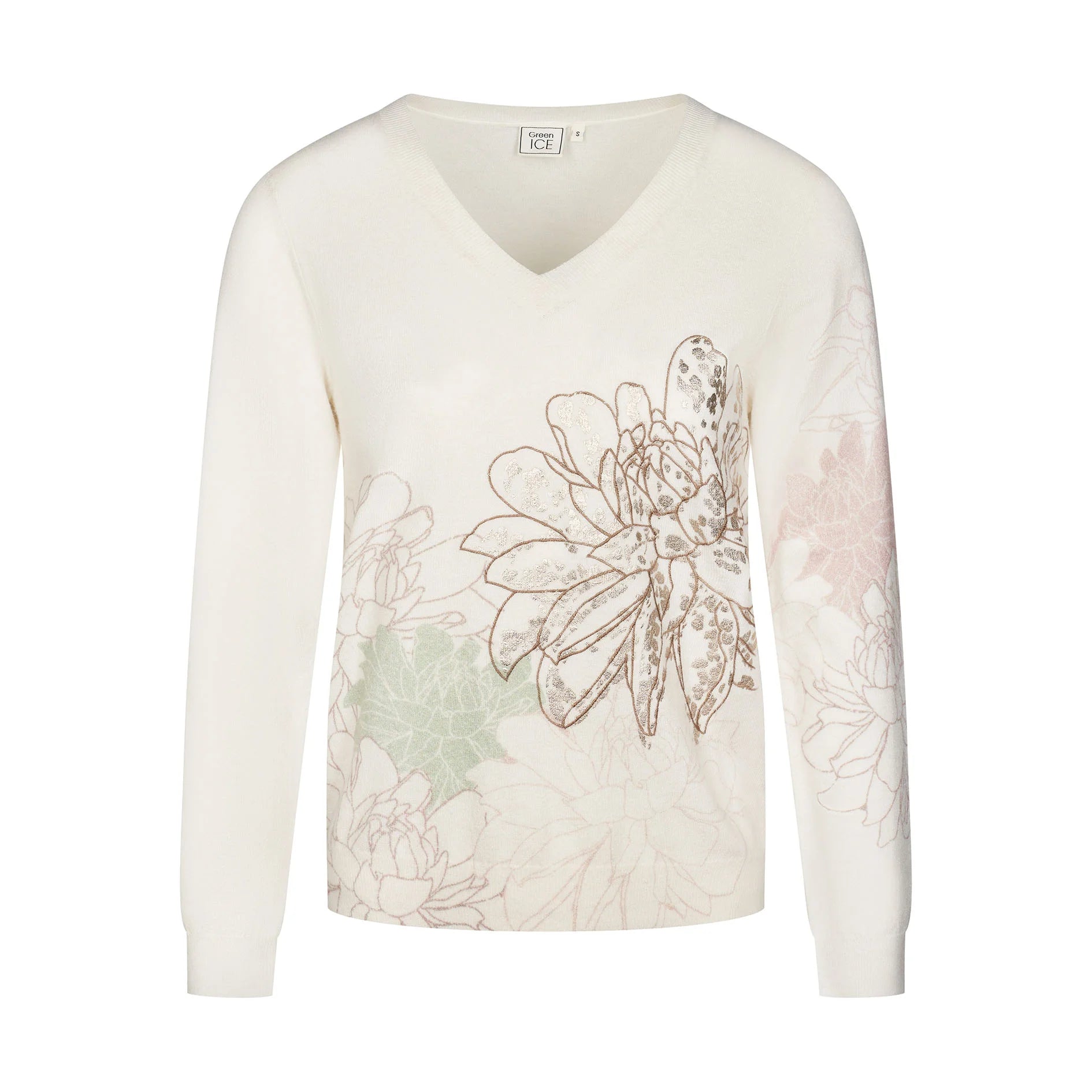 Fijngebreide trui (12-gauge) met decoratief punch needle borduursel en sportieve ribboorden voor een moderne, textuurrijke look.