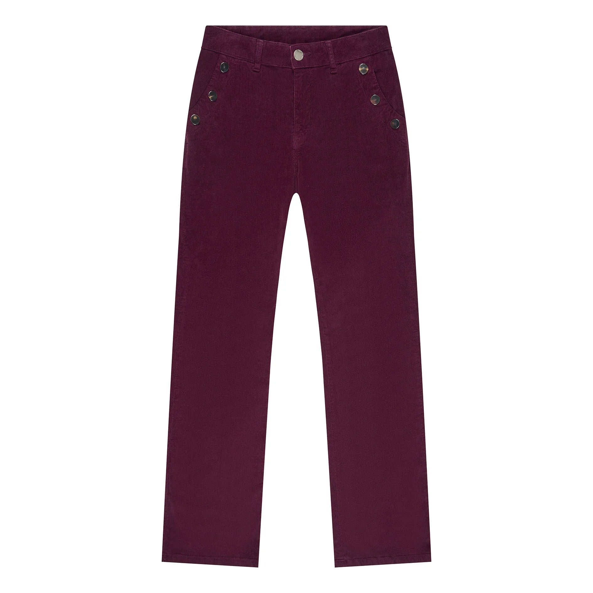 Een broek met een binnenbeenlengte van 78cm, een flared pasvorm en afgewerkt in fijne ribfluweel