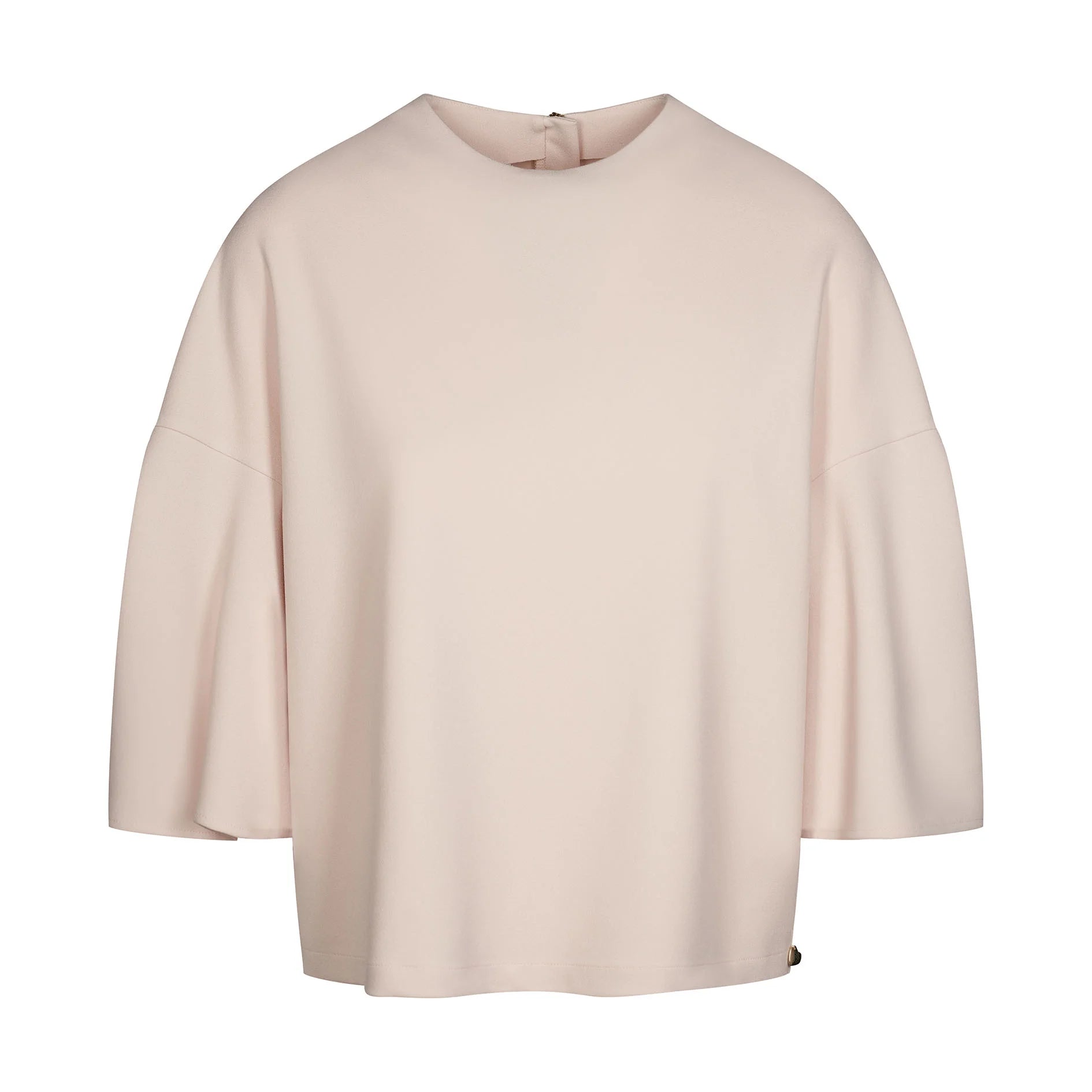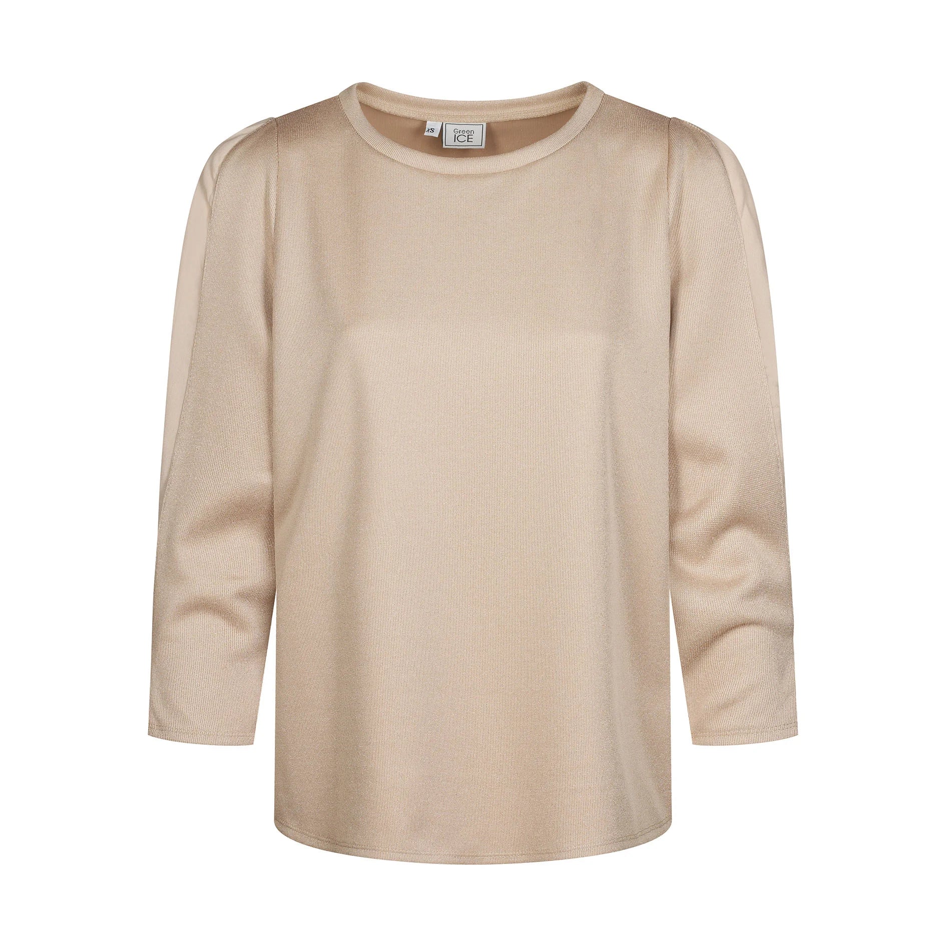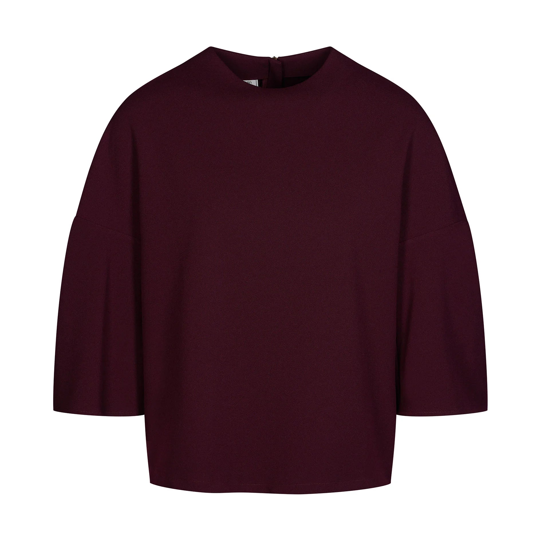 Een sweater met opstaande kraag en afgewerkt met een iets bredere 3/4de mouw