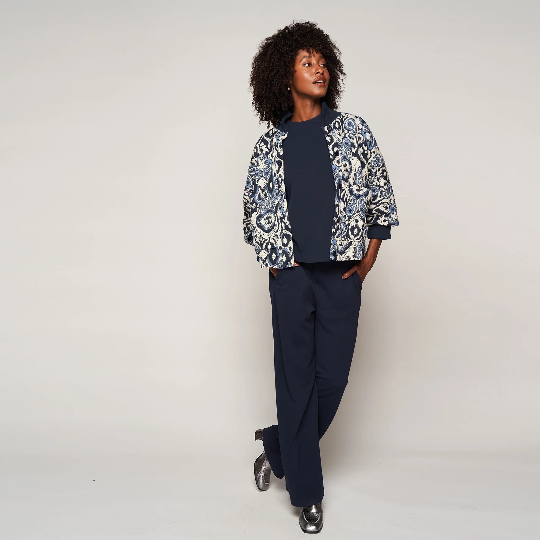 Een broek met een binnenbeenlengte van 80cm, voorzien van een wijde pasvorm en afgewerkt met een elastische tailleband