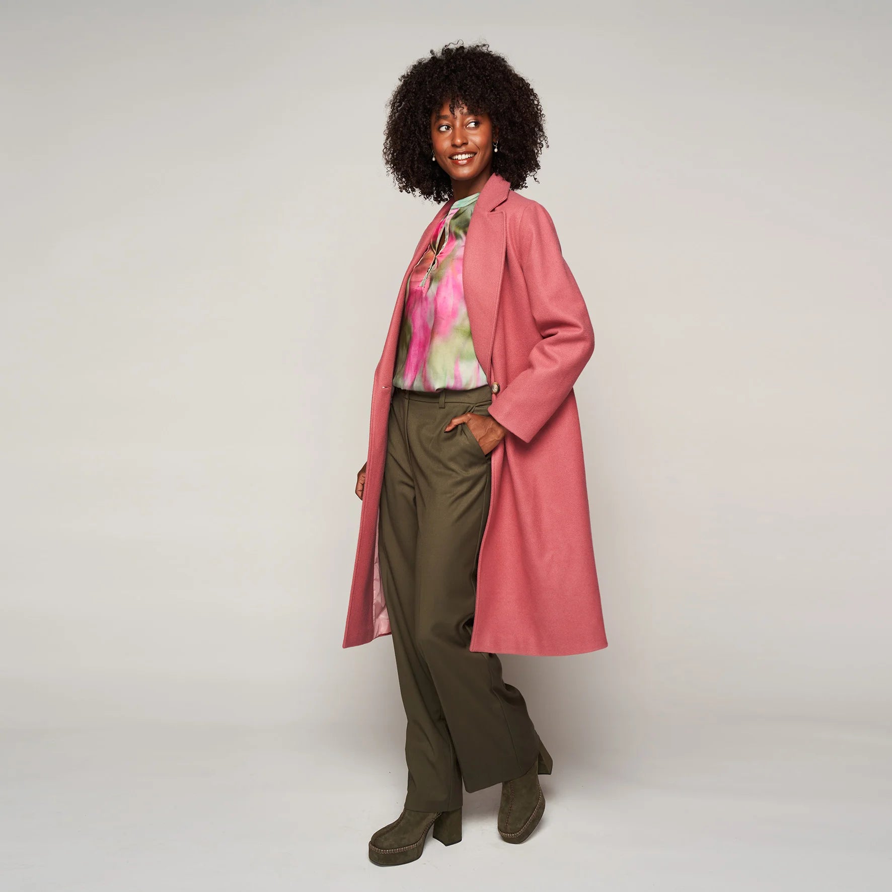 Een lange jas, voorzien van zakken aan de voorzijde