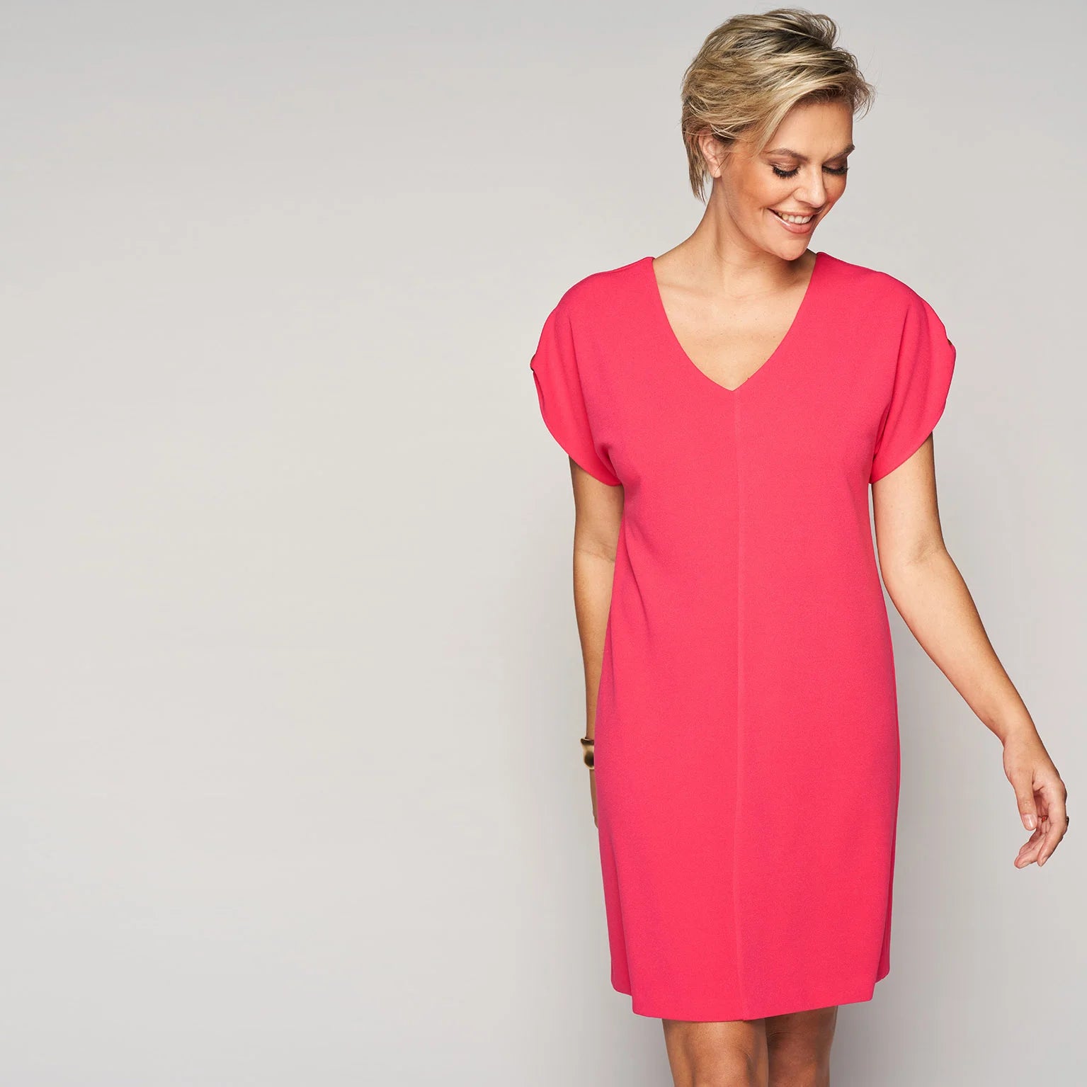 Jurk met V-hals en kruis opening op de rug, voorzien van een totale lengte vanaf het schouder-nekpunt van 95 cm voor een elegante en vrouwelijke pasvorm.