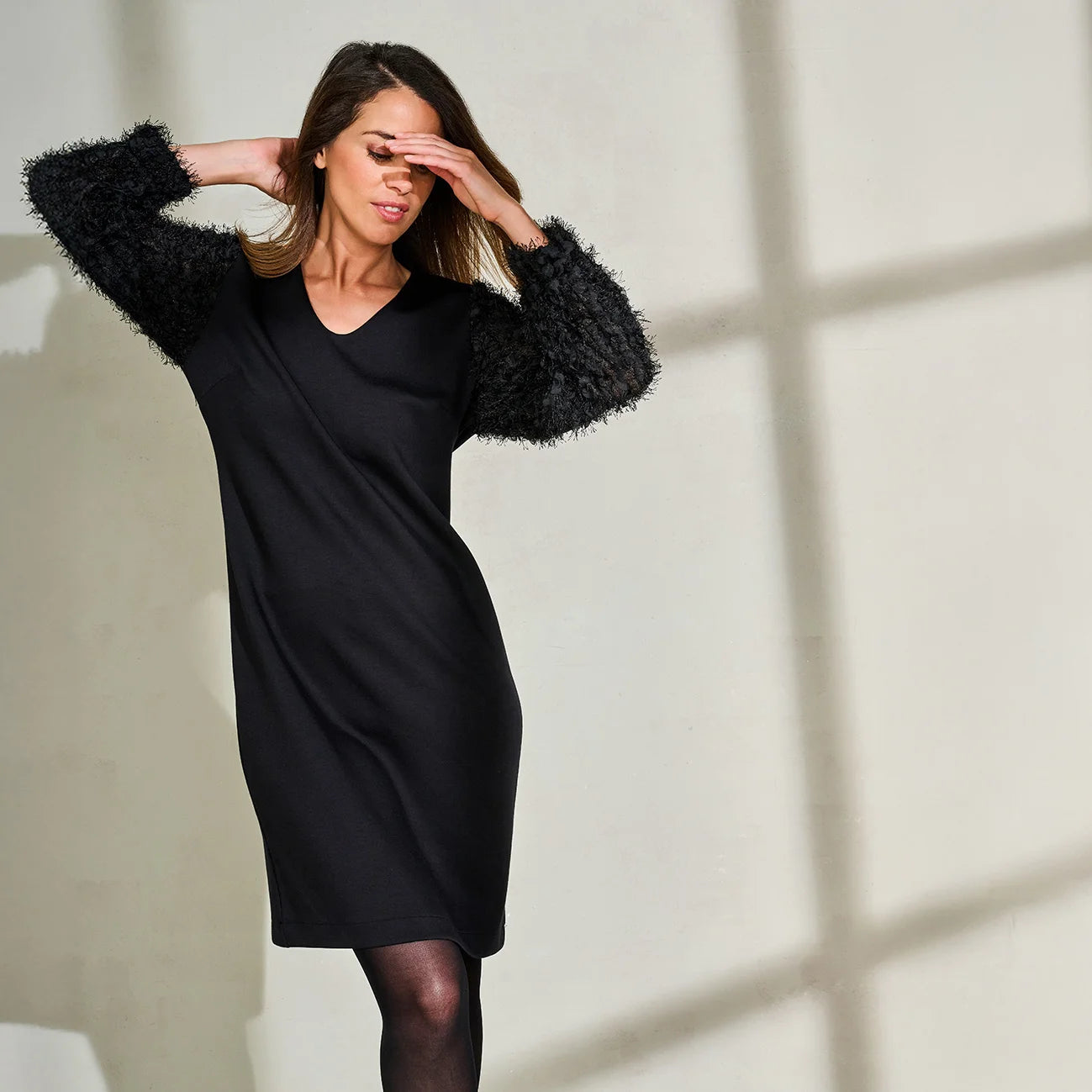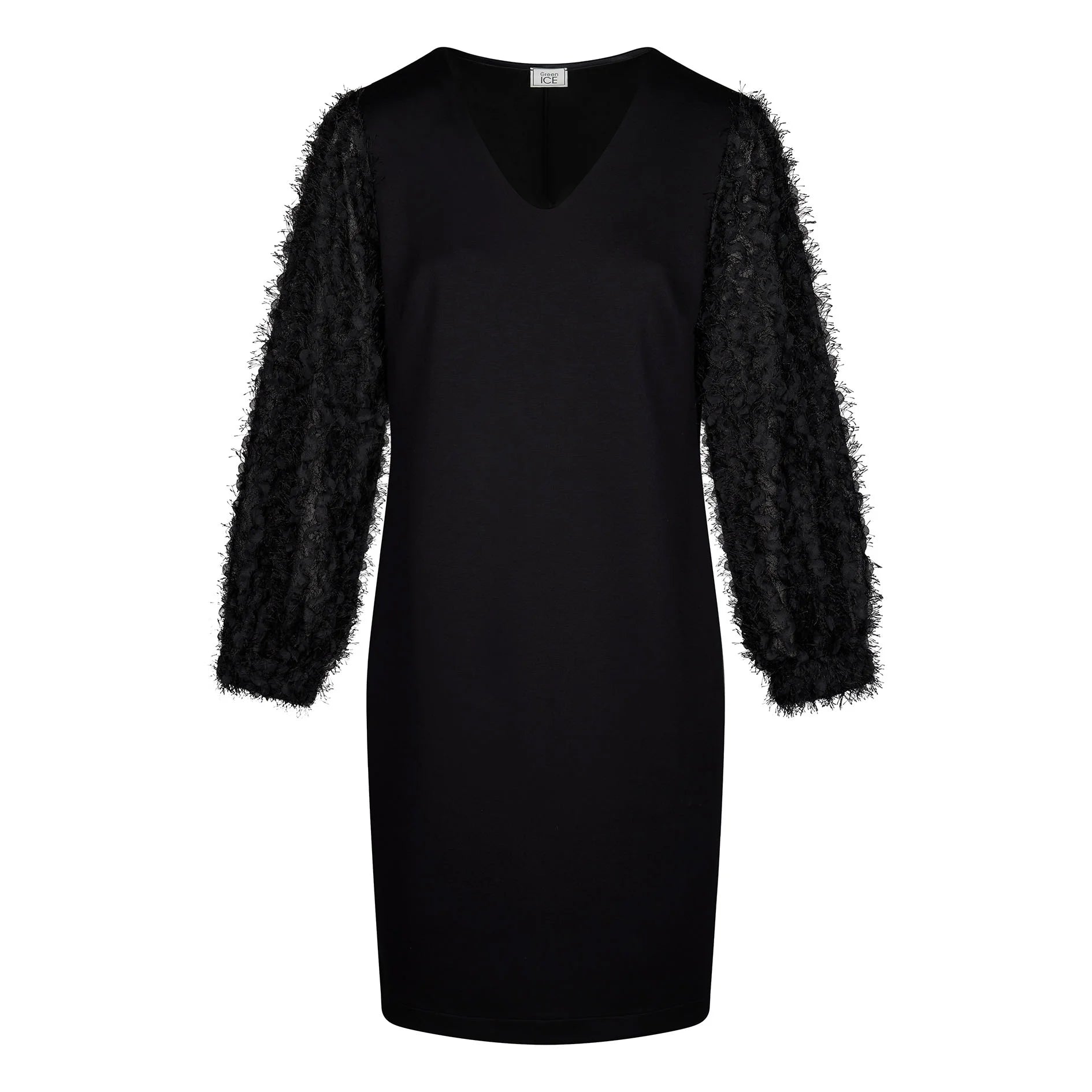 Een elegante jurk met een totale lengte vanaf het schouder-nekpunt van 102cm, afgewerkt met kanten mouwen voor een verfijnde en vrouwelijke look
