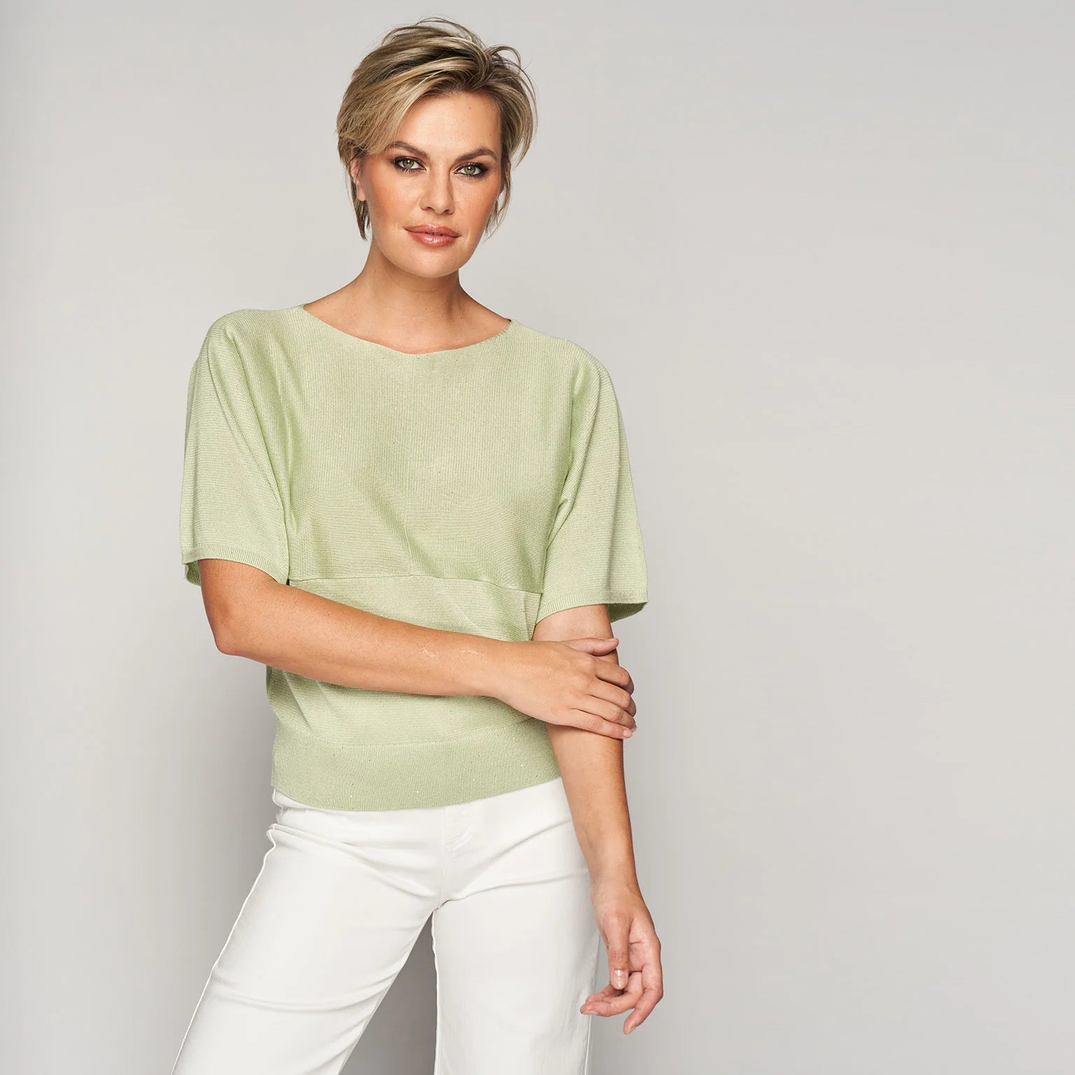 Lichte fijngebreide trui met korte mouwen en afgewerkt met enkele pailletten voor een elegante en comfortabele look