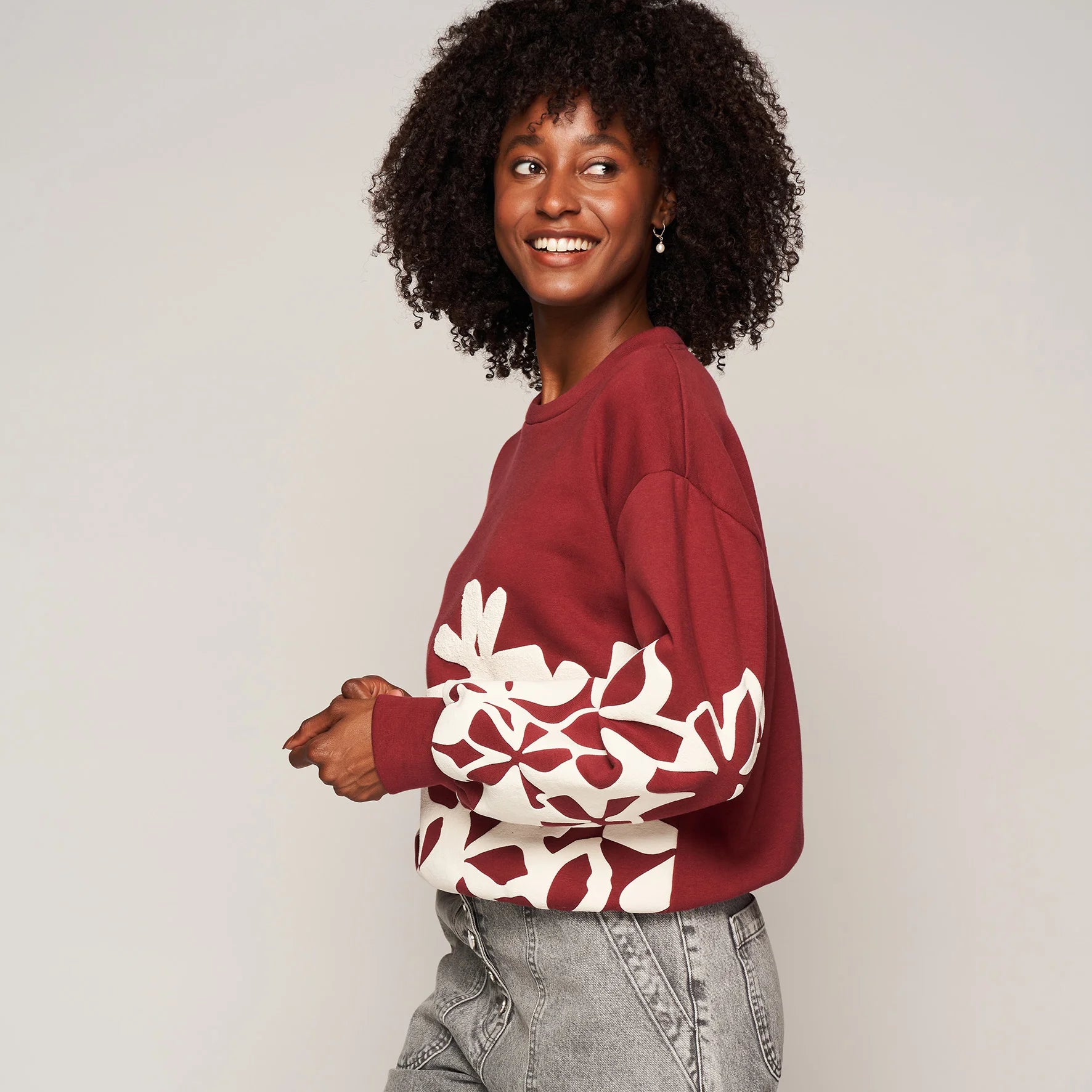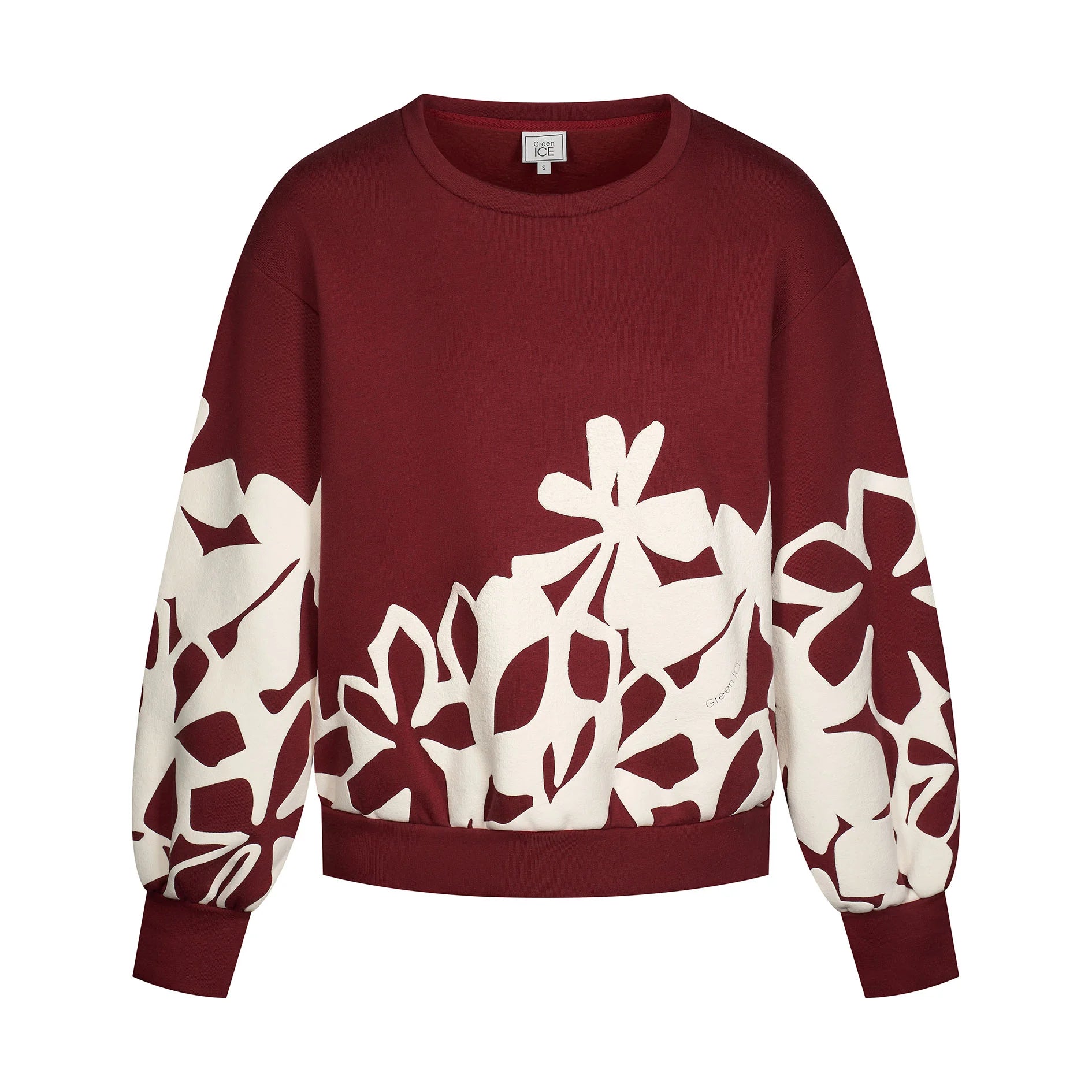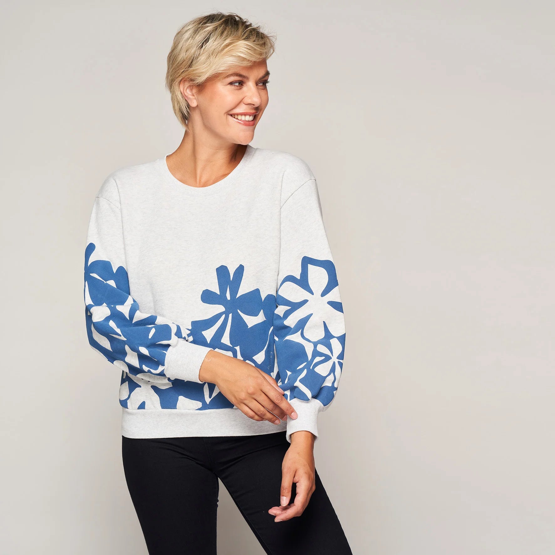 Een sweater met ballonmouwen en een opvallend artwork op zowel de voorzijde als de mouwen voor een modieuze uitstraling