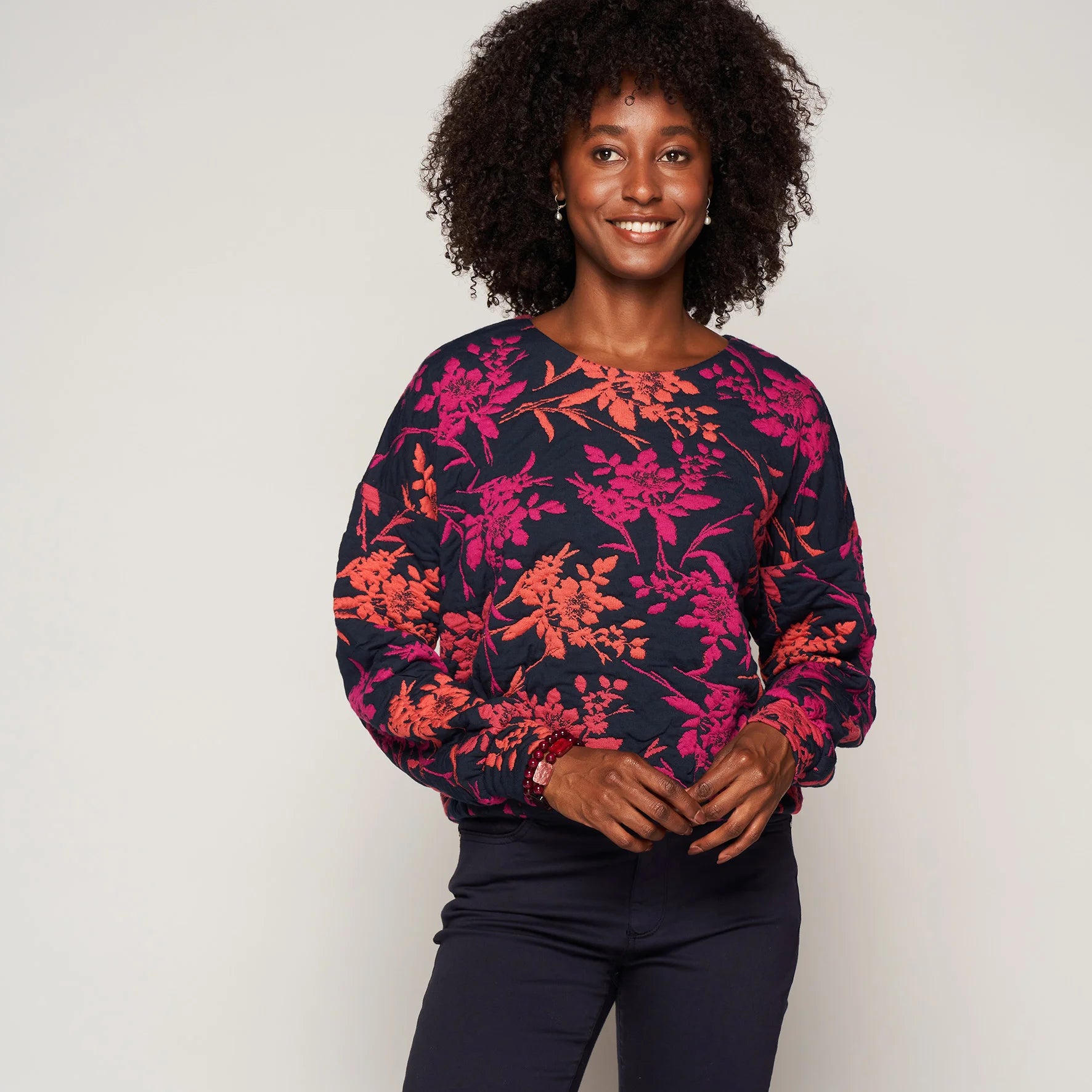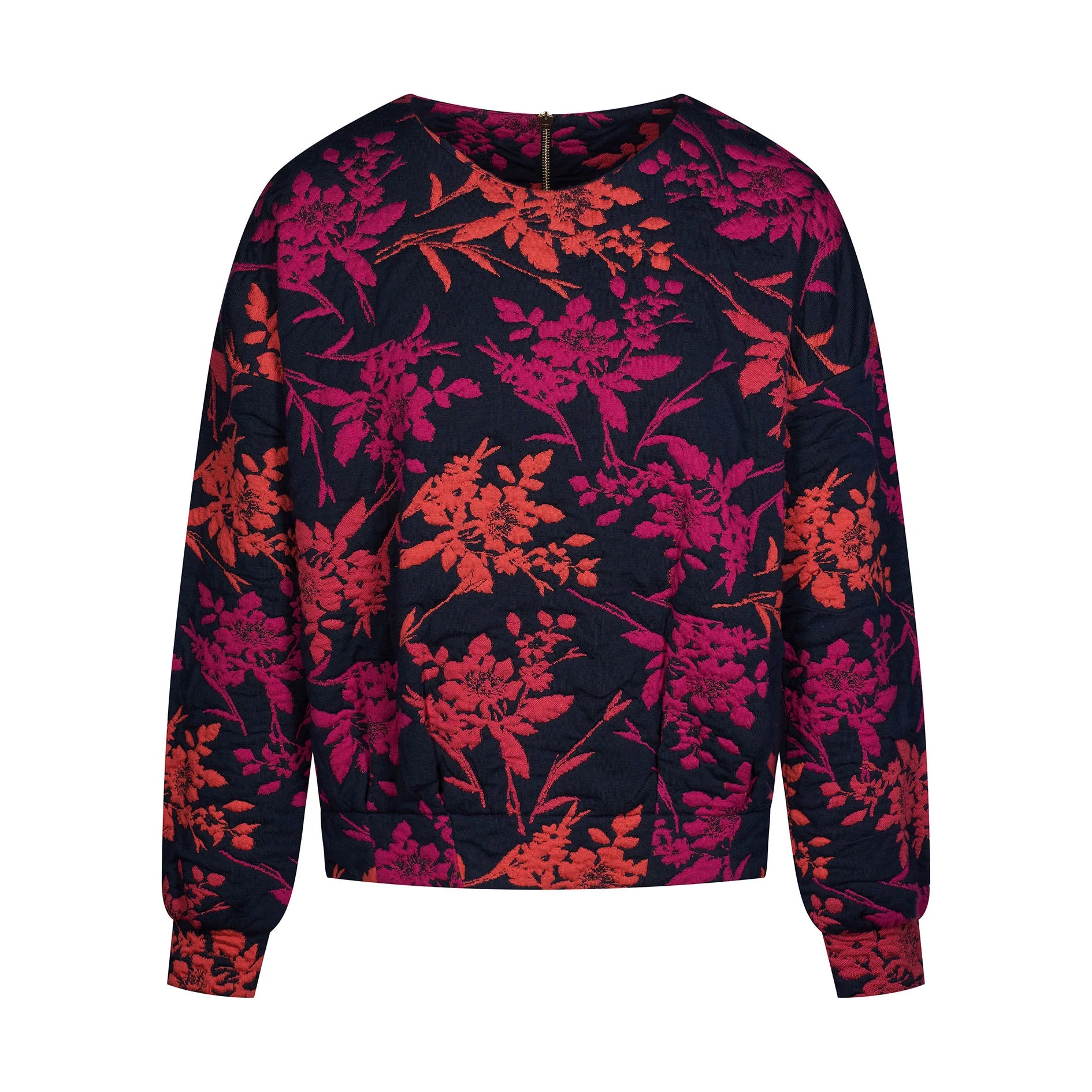 Een comfortabele sweater, voorzien van een patroon print en afgewerkt met decoratieve plooien onderaan voor een speelse en moderne look